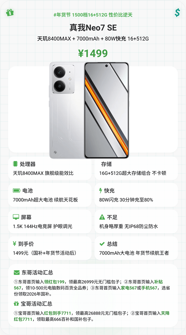 主打极致续航,1499元16+512G配置性价比拉满,搭载天玑8400max处理器,安兔兔跑分约90万,日常使用、轻度游戏流畅无压力,16+512G存储满足大量照片、视频存储需求。核心优势是7000mAh超大电池,重度使用能撑两天,搭配80W快充,碎片化充电即可满足日常需求;6.7英寸120Hz高刷屏流畅丝滑,标配全功能NFC,实用性不错。