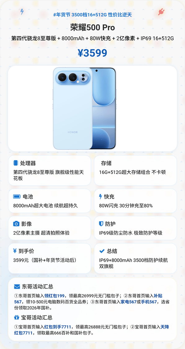 2. 荣耀500Pro(国补+活动到手价3599元)——推荐星级:★★★★☆(4星半)