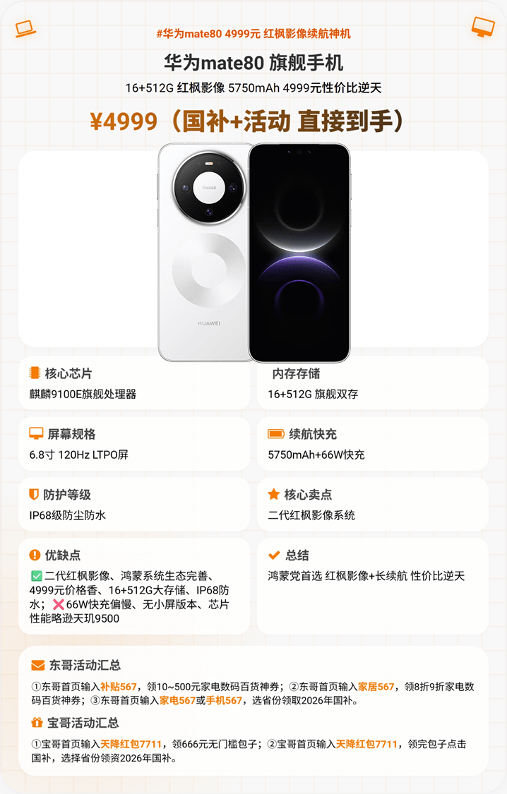 3. 华为Mate80(国补+活动到手价4999元)——推荐星级:★★★★☆(4星半)