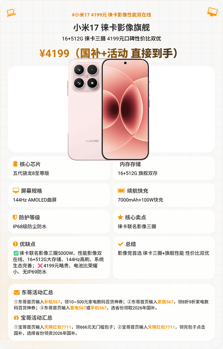 3500元档全能旗舰天花板,3399元16+512G存储,搭载第四代骁龙8至尊版芯片,搭配澎湃OS深度优化,日常使用、大型游戏、剪视频均无压力。核心优势是徕卡影像,后置三个5000万像素全焦段镜头(主摄+超广角+10倍无损潜望长焦),徕卡Summilux光学系统加持,色彩还原细腻、氛围感拉满,随手拍出徕卡大片。