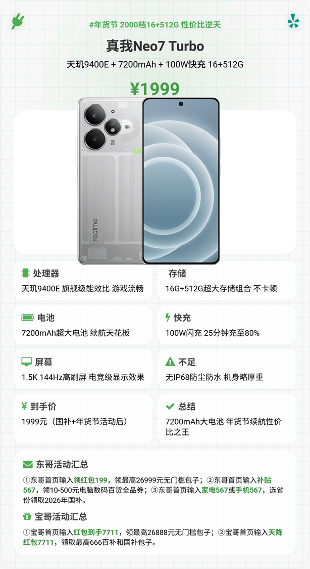 2000元档续航王者,1999元16+512G存储,搭载天玑9400e芯片,安兔兔跑分超216万,日常、轻度游戏流畅,低功耗加持续航。核心优势是7200mAh超大电池,重度使用可两天一充,搭配100W快充35分钟满电,续航与补电兼顾。