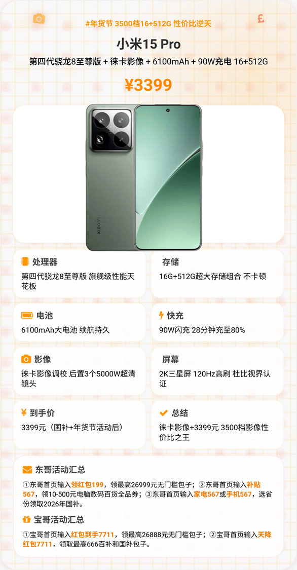 1. 小米15Pro(国补+活动到手价3399元)——推荐星级:★★★★★(5星首选)
