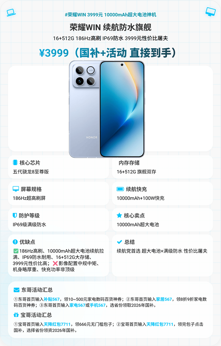 2. 荣耀win(国补+活动到手价3999元)——推荐星级:★★★★☆(4星半)